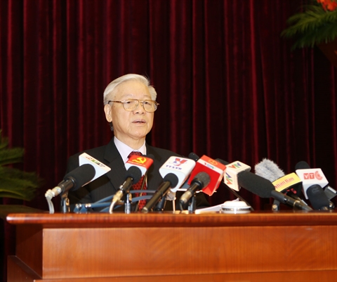 | Le secrétaire général Nguyên Phu Trong prononce le discours d’ouverture du 4e plénum du Comité central du Parti communiste du Vietnam. |