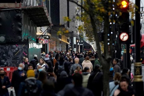 | La foule se presse dans la rue commerçante d'Oxford Street à Londres, le 2 décembre 2020, au premier jour de la levée du confinement en Angleterre. |