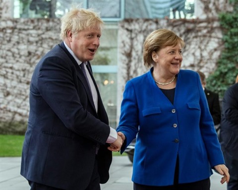 | La chancelière allemande Angela Merkel et le Premier ministre britannique Boris Johnson, à Berlin le 19 janvier 2020. |