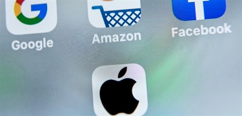 | Logos des géants des technologie américains, Google, Amazon, Facebook, Apple, affichés sur une tablette à Lille, le 28 août 2019. |