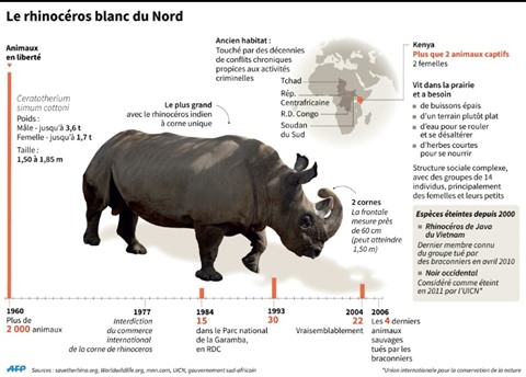 Sudan, dernier mâle rhinocéros blanc du Nord, est mort en mars à l'âge de 45 ans dans la réserve kényane d'Ol Pejeta, laissant derrière lui sa fille et sa petite-fille, Najin et Fatu, dernières représentantes sur la planète de cette sous-espèce africaine décimée par le braconnage.