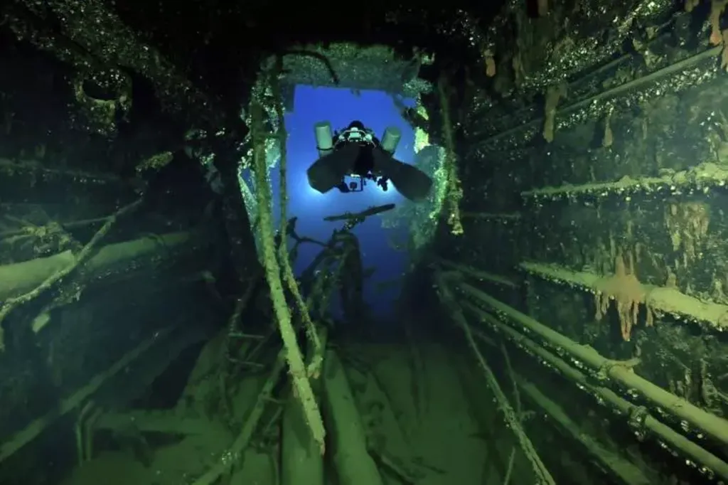 | Un plongeur explorant le HMHS Britannic, bateau jumeau du Titanic, transformé en navire-hôpital pendant la Première Guerre mondiale, qui a coulé près de l'île grecque de Kéa en 1916 après avoir heurté une mine. |