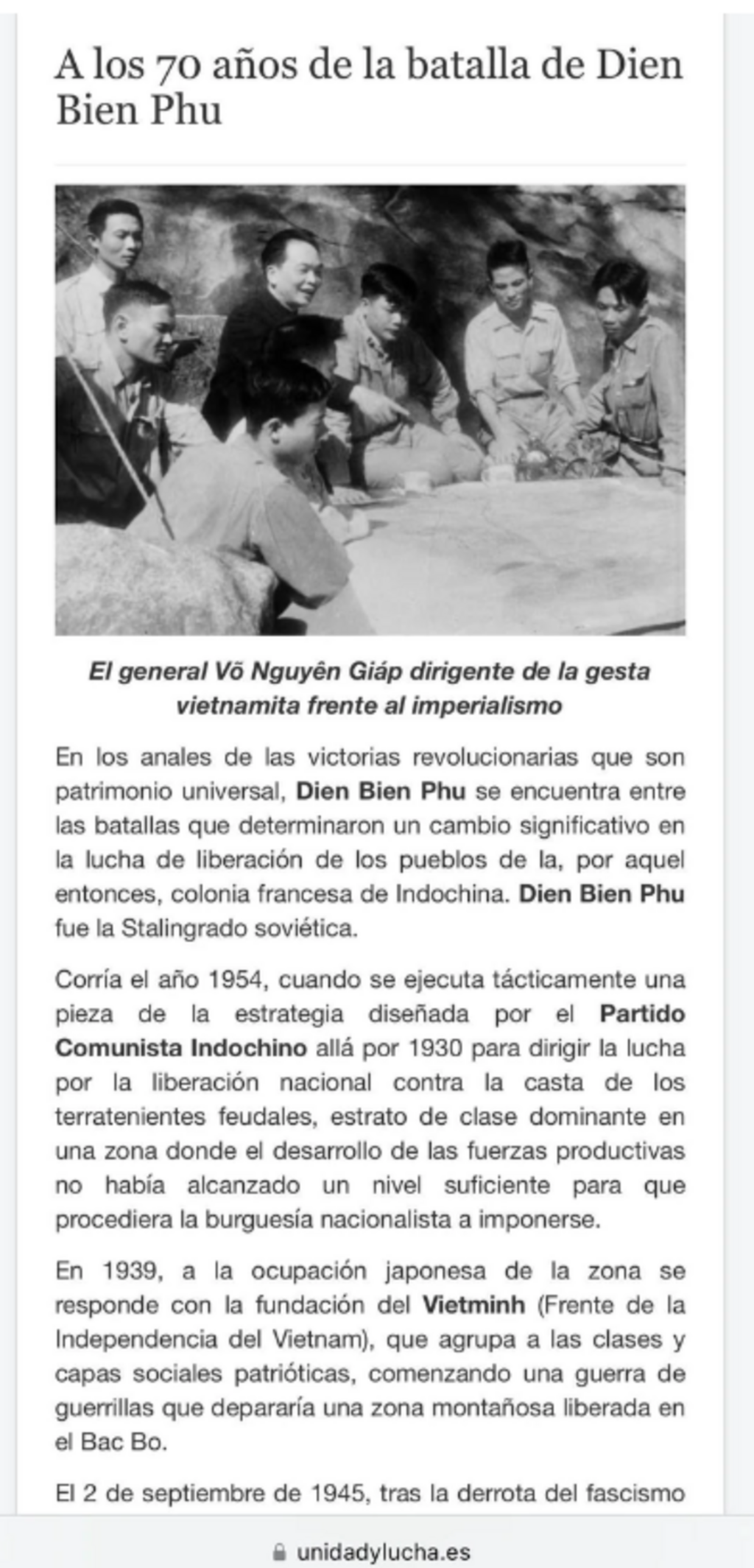 Unidad y Luch, organe du Parti communiste des peuples d’Espagne (PCPE), a récemment publié un article faisant l’éloge de l’armée vietnamienne et de la victoire de Diên Biên Phu le 7 mai 1954, qui "résonna à travers les cinq continents et ébranla le monde", en faisant référence à la bataille de Stalingrad pendant la Seconde Guerre mondiale.