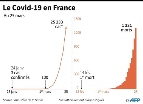 | Évolution du nombre de cas de COVID-19 en France, au 25 mars. |