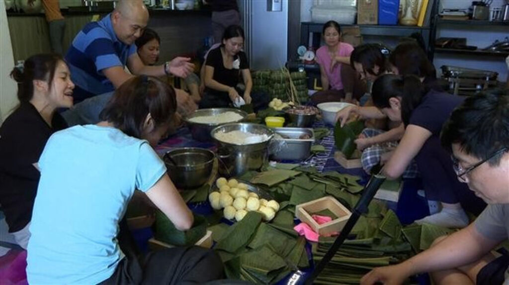 Pour préparer le banh chung, des feuilles de dong et des ficelles de bambou ont été envoyées du Vietnam par des missions de travail, puis congelées. Du riz gluant et des haricots mungo sont également envoyés du Vietnam. C'est l'occasion pour les femmes et les mères de partager leurs expériences aux enfants sur la manière de laver les feuilles de dong, le riz, les haricots, etc., pour réaliser des banh chung verts, parfumés et sains.