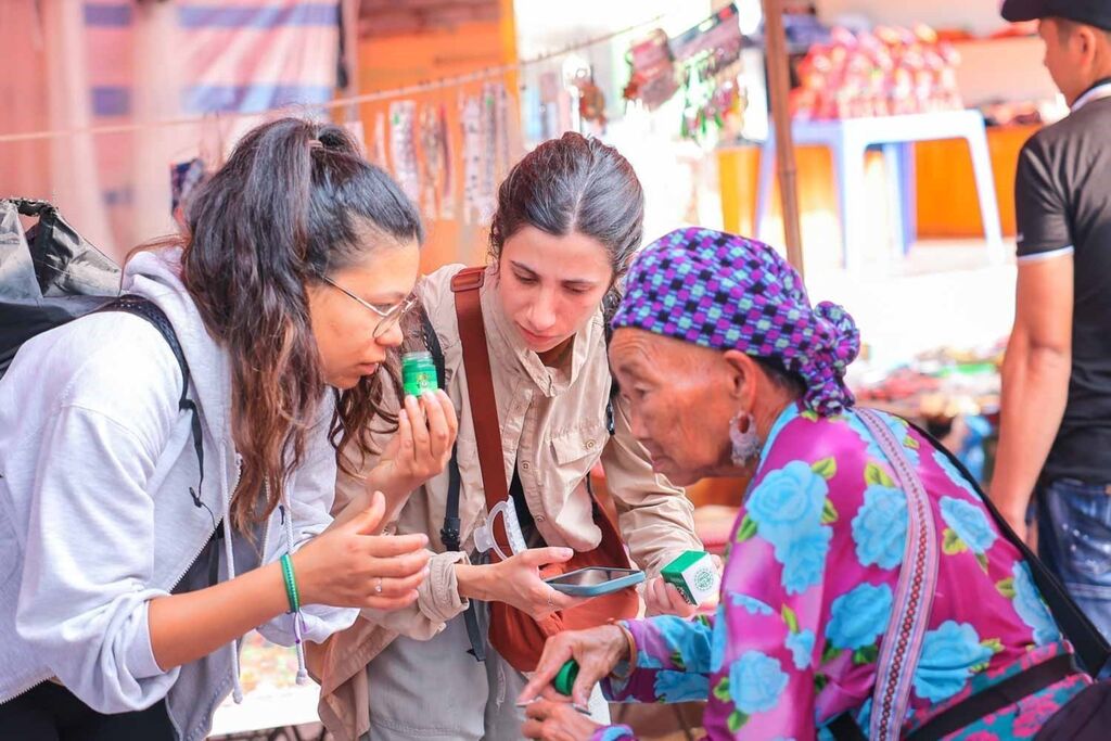 | Les touristes étrangers découvrent les produits d'un marché local à la montagne. |
