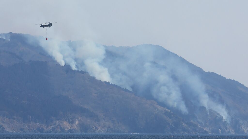 | Un hélicoptère bombardier d'eau survole un incendie de forêt à flanc de montagne près de la ville d'Ofunato, dans la préfecture d'Iwate, le 28 février au Japon. |