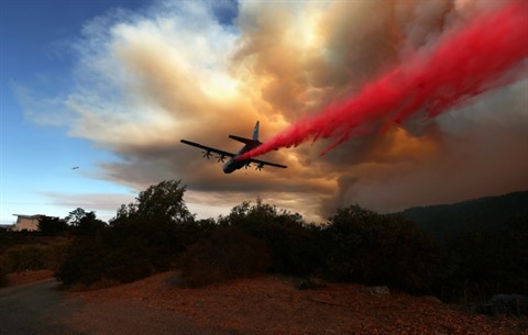 | Un avion déverse une substance qui ralentit la progression du feu en Californie. |