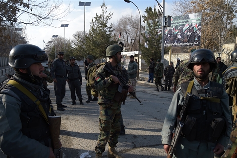 | Les forces de sécurité déployées le 8 mars à Kaboul lors de l’attaque du plus important hôpital militaire. |