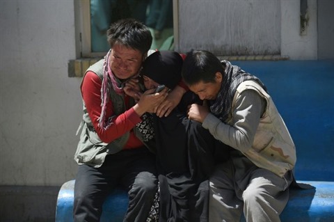 | Des Afghans pleurent leurs proches tués dans un attentat-suicide à Kaboul le 22 avril devant un centre pour les législatives. |