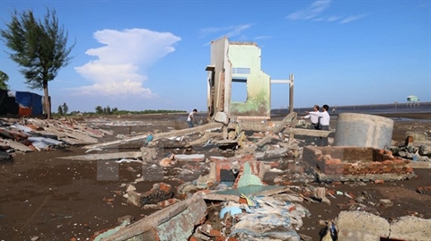 | Une maison dans le hameau de Câu Muong, province de Tiên Giang (delta du Mékong), détruite par la montée des eaux. |