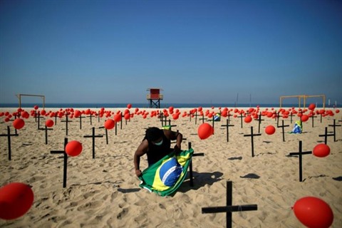 | Un homme prépare une cérémonie d'hommage aux victimes du COVID-19, sur la plage de Copacabana à Rio de Janeiro (Brésil), le 8 août. |