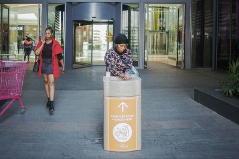 | Des stands pour se laver les mains ont été installées par le Centre commercial Africa Mall à Johannesburg. |