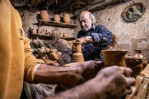 | Missak Antranik Petros, artisan potier dans son atelier près de Qamichli en Syrie, et son fils Yerevan, le 19 décembre. |