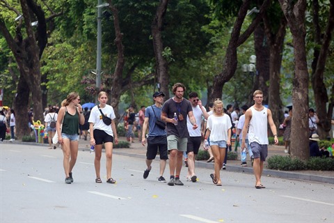 | Les touristes étrangers dans la rue piétonne près du lac Hoàn Kiêm, à Hanoï. |