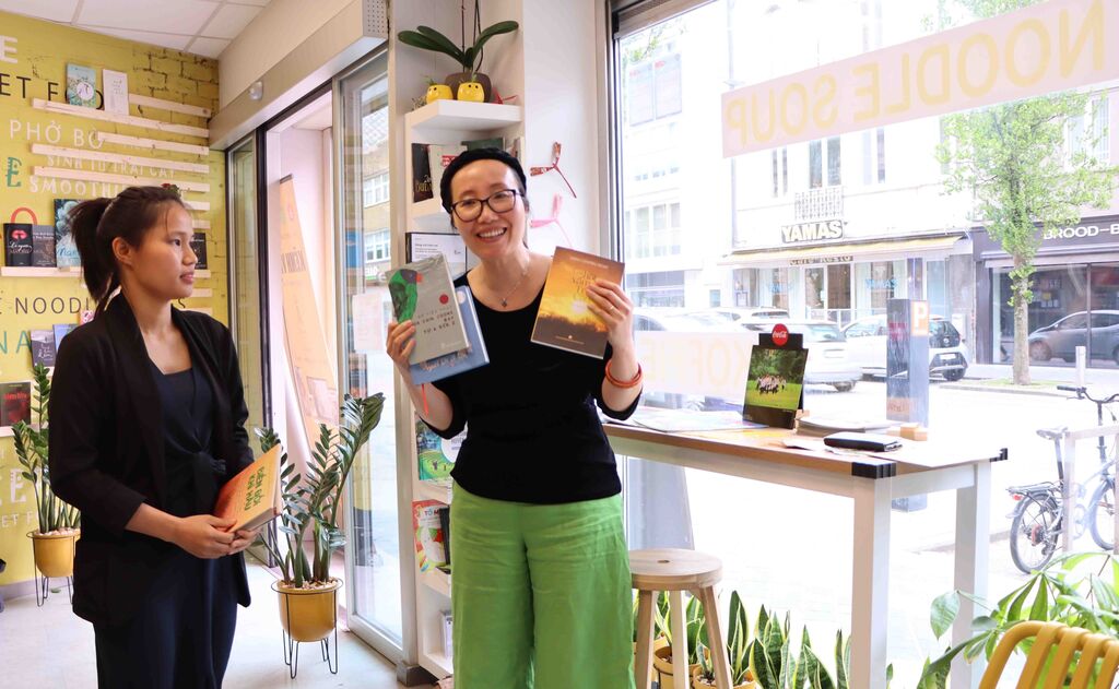 | La poète Nhu Quynh de Prelle (droite) présente ses livres dans le projet. |