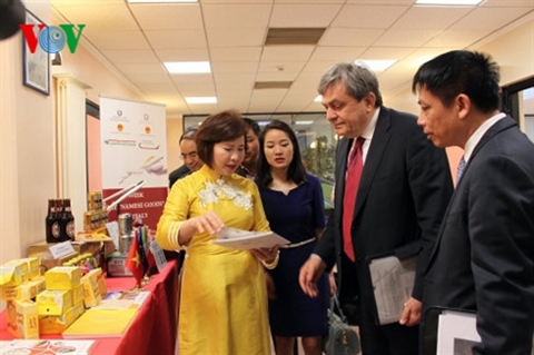 | La vice-ministre de l’Industrie et du Commerce, Hô Thi Kim Thoa, présente des produits du Vietnam aux amis italiens. |