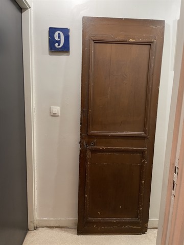 | La porte en bois et la plaque No9 de l’ancienne maison dans l’impasse Compoint (17e arrondissement), où l'Oncle Hô a vécu de juillet 1921 à juin 1923. |
