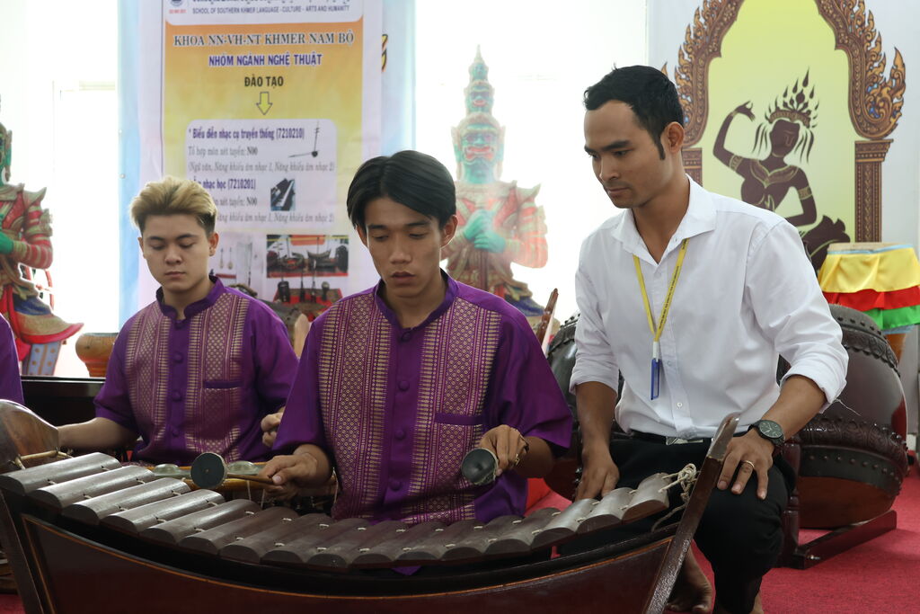 | Thach Hoài Thanh (chemise blanche), enseignant d’instruments khmers au Collège de langue, culture, arts khmers et de sciences humaines de l'Université de Trà Vinh. |