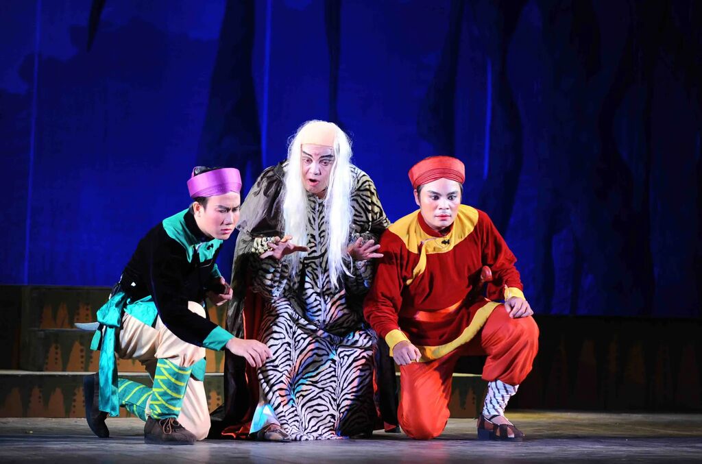 | Des artistes de la troupe de chèo de Hai Phong interprètent la pièce “Le roi se transforme en tigre” lors de la soirée d’ouverture du concours national professionnel du chèo 2013. |