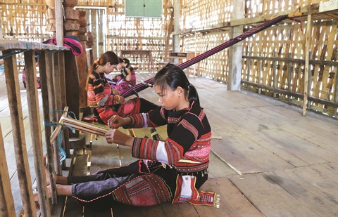 | Jeunes tisseuses de Po Nang travaillant sur d’anciens métiers à tisser. |