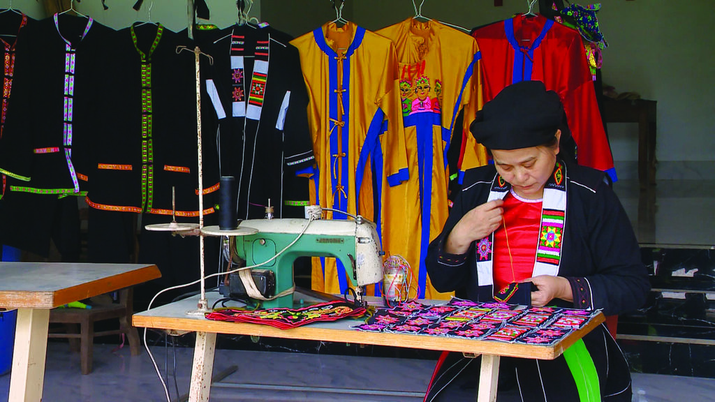 Les femmes du village de Sung, commune de Cao Son, district de Da Bac, province de Hoa Binh, en sont un exemple. Chaque jour, Ly Sao Mai, cheffe du groupe de tourisme communautaire, guide les femmes pour broder les costumes des Dao Tiên, maintenant à la fois le métier de broderie traditionnelle et servant aussi les touristes. “La broderie se transmet de génération en génération. Dans chaque famille, ce sont les femmes qui s’en chargent. Elles brodent des costumes pour tous les membres de leur famille. Nous brodons des motifs uniques, en particulier sur les robes de femmes”, explique Ly Sao Mai.