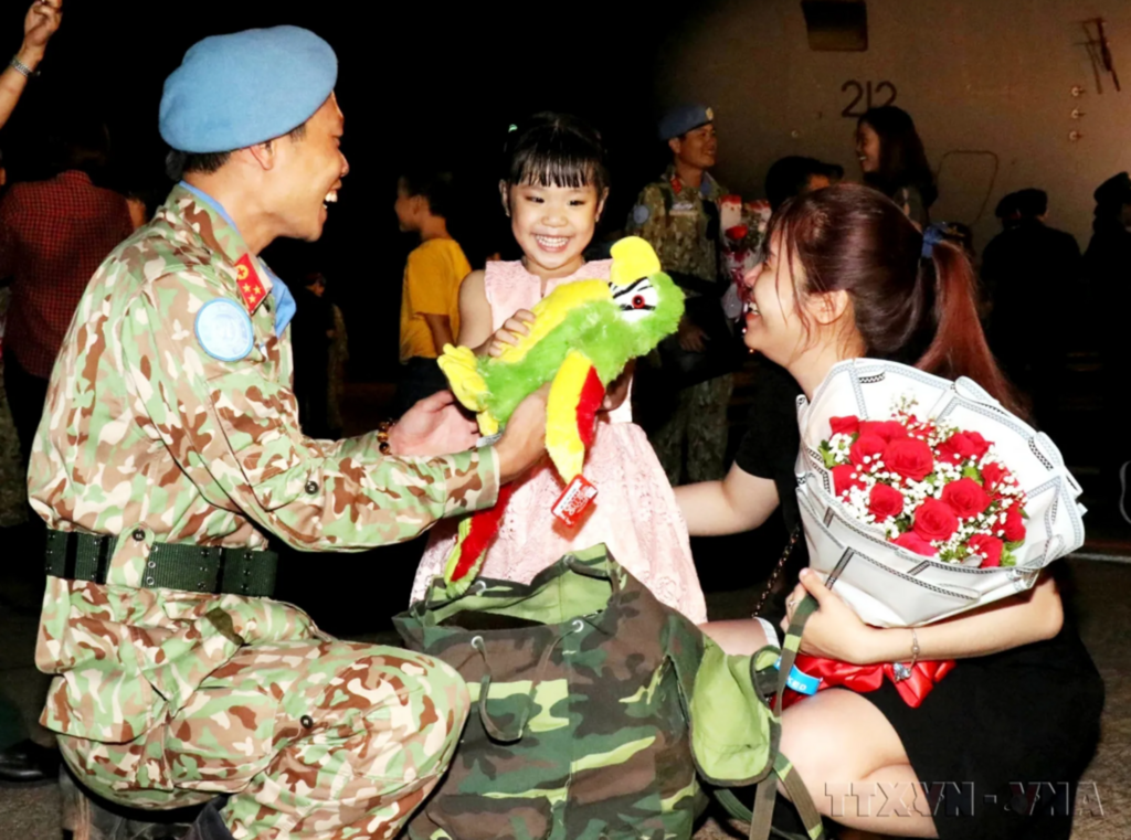 | Célébration de la Journée de la famille vietnamienne en 2023 : retrouvailles d’un soldat qui vient de terminer sa mission de maintien de la paix au Soudan du Sud, avec sa famille. |