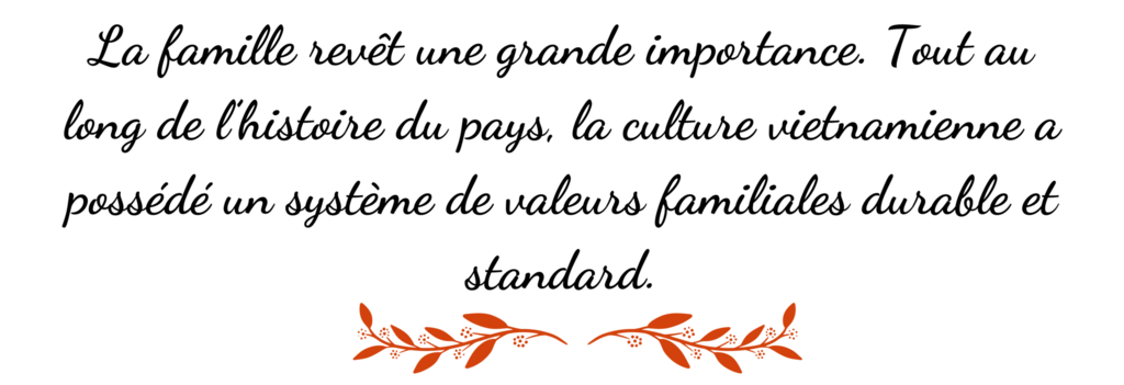 Le système de valeurs familiales vietnamiennes préserve les précieuses traditions culturelles de la nation, à travers des activités spécifiques telles que la préservation de la langue maternelle, la gastronomie traditionnelle, les costumes, les mariages, les funérailles et le culte des ancêtres.