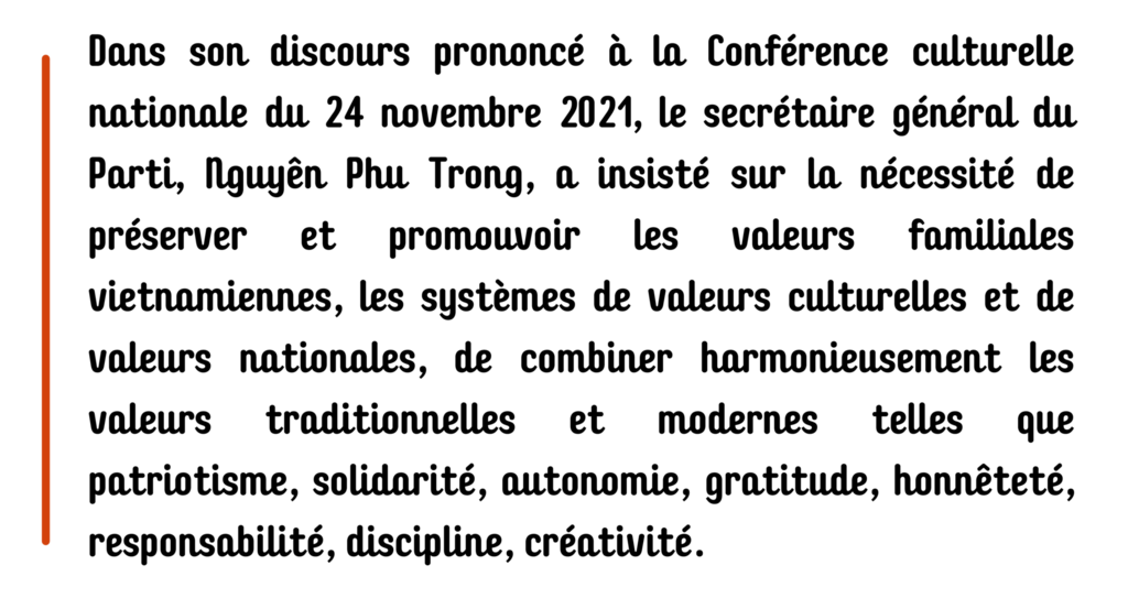 La Résolution du XIIIe Congrès national du Parti indique : "Édifier des familles vietnamiennes prospères, progressistes, heureuses et modernes ; édifier un système de valeurs nationales, un système de valeurs culturelles et des normes humaines associés à la préservation et au développement du système de valeurs familiales vietnamiennes dans la nouvelle ère".