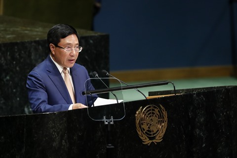| Le vice-Premier ministre et ministre des Affaires étrangères, Pham Binh Minh, s’adresse au débat général de la 74e Assemblée générale de l’ONU. |