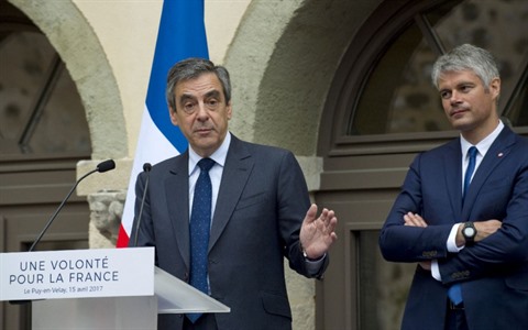 | François Fillon (gauche) fait une déclaration aux côtés du président du conseil régional Auvergne-Rhône-Alpes, Laurent Wauquiez, lors d'une visite au Puy-en-Velay, le 15 avril 2017. |