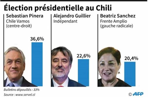 Le milliardaire Sebastian Piñera, 67 ans, donné favori pour succéder à la présidente de gauche Michelle Bachelet, était crédité de 36,64% des voix, et le journaliste Alejandro Guillier, 64 ans, obtenait 22,69% des voix, talonné par la candidate de la coalition d'extrême gauche Frente Amplio (20,28%), selon des résultats partiels portant sur 98,95% des bulletins de vote.