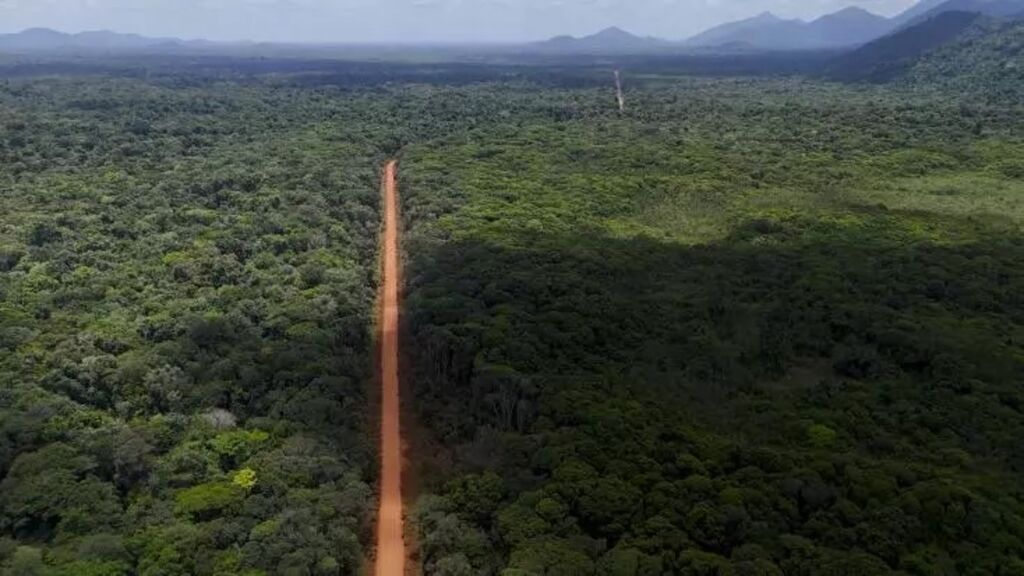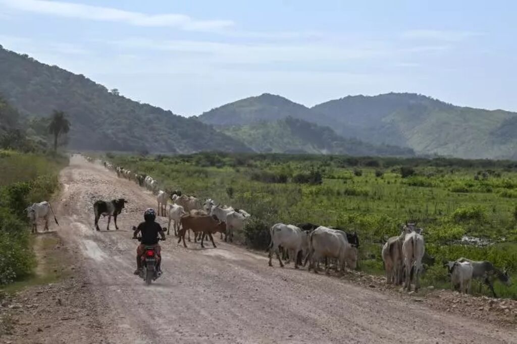 | Un cyclomoteur emprunte la piste reliant Georgetown, capitale du Guyana, à Lethem, dans le sud-ouest, à la frontière du Brésil, le 28 août 2025 près de Kurupukari. |