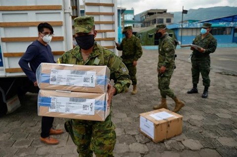 | Des militaires livrent des kits électoraux à un bureau de vote à Quito, le 10 avril, à la veille du scrutin présidentiel. |