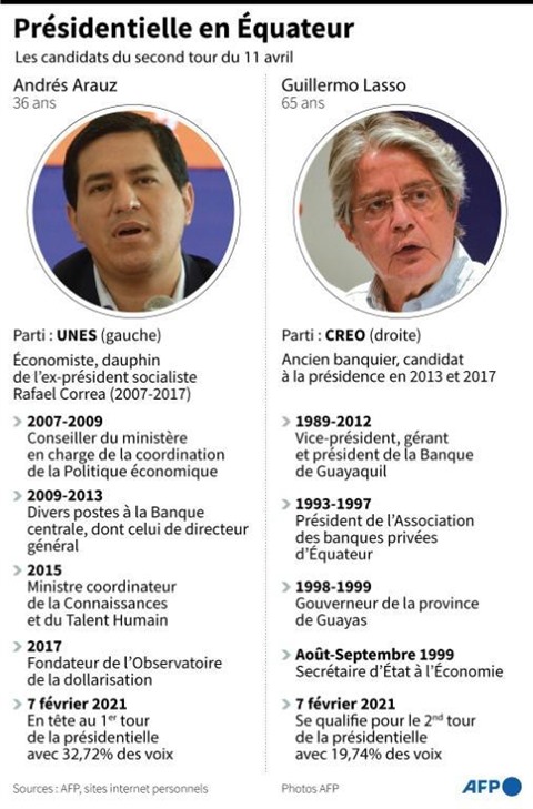 Le directeur de l'institut Market, Blasco Peñaherrera, présage d'un second tour "totalement incertain", soulignant une hausse aussi du "nombre d'indécis à 15%" ce qui "peut faire varier" le résultat final. Deux modèles sont en jeu, entre le retour du socialisme et l'accentuation du virage à droite, initié par Moreno, qui s'est rapproché du patronat et des organismes financiers, au grand dam de son prédécesseur Correa qui l'avait initialement parrainé.Gouvernance difficileL'ex-président, qui a modernisé l'Équateur grâce à la manne pétrolière, vit en Belgique, pays de son épouse, depuis son départ du pouvoir en 2017. S'il reste populaire, ce dont profite son poulain, son tempérament polémique et les scandales de pots-de-vin éclaboussant son gouvernement lui portent préjudice. En 2020, il a été condamné par contumace à huit ans de prison pour corruption, ce qui l'a empêché de viser la vice-présidence.Si Arauz l'emporte, "le premier point à l'agenda du gouvernement sera le retour de Correa", estime le politologue Santiago Basabe, de la Faculté latino-américaine de sciences sociales (Flacso). Son jeune dauphin se défend toutefois d'être une marionnette. "Nous aurons une relation très dynamique, très profitable pour le pays (...) mais celui qui gouvernera, ce sera moi!", a-t-il affirmé à l'AFP. Afin de redresser le pays, il veut "renégocier l'accord" avec le FMI, signé en échange d'un prêt de 6,5 milliards de dollars.De son côté, Lasso entend relancer l'économie par un développement des échanges et vise un "déficit zéro pour ne pas aggraver la dette". Mais s'il gagne, le conservateur devra composer avec une forte opposition: sans atteindre la majorité, l'Unes s'est imposée comme premier groupe au parlement monocaméral. Cela laisse craindre "une tension permanente avec l'exécutif", selon le politologue de la Flacso.Pour l'analyste Oswaldo Moreno, quel que soit le vainqueur, il devra "se concerter avec de nombreux acteurs", a fortiori en cas d'un vote nul important qui "légitimerait de futures manifestations" affectant "la gouvernance du prochain président".