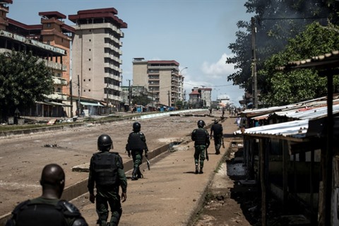 | Des policiers déployés à Conakry pendant des manifestations à Conakry, le 23 octobre. |