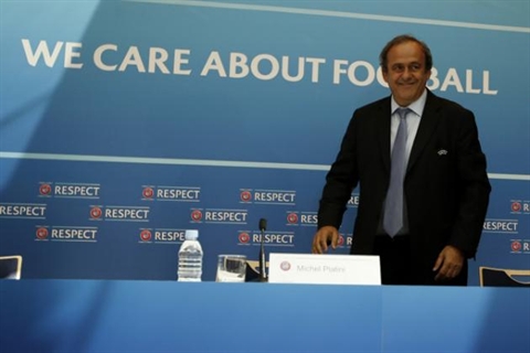 | Michel Platini s'installe pour une conférence de presse à l'issue du tirage au sort des poules de l'Europa League, le 28 août à Monaco. |
