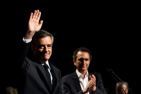 | François Fillon salue ses supporters à l'issue d'un meeting à Aubervilliers, le 4 mars 2017 près de Paris |