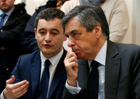 | Le premier vice-président de la région Hauts-de-France, Gérald Darmanin (gauche), s'entretient avec François Fillon, le 17 février à Tourcoing. |
