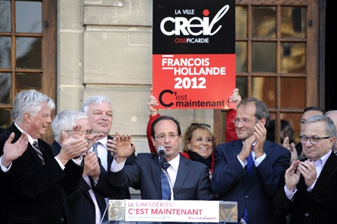 | Le socialiste François Hollande prend la parole lors d’une rencontre avec ses supporteurs le 6 avril à Creil |