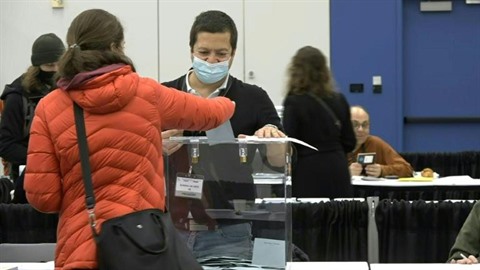 | Un électeur d'outre-mer dépose son bulletin dans l'urne lors du premier tour de l'élection présidentielle française, le 9 avril 2022 à Saint-Pierre-et-Miquelon. |