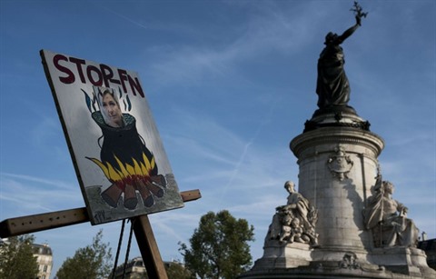 | Une pancarte contre le FN, Place de La République, à Paris. |