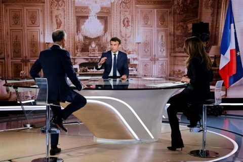 | Le candidat-président Emmanuel Macron lors d'une interview avec Anne-Claire Coudray (droite) et Gilles Bouleau (gauche) sur le plateau de TF1 à Boulogne-Billancourt, le 6 avril. |