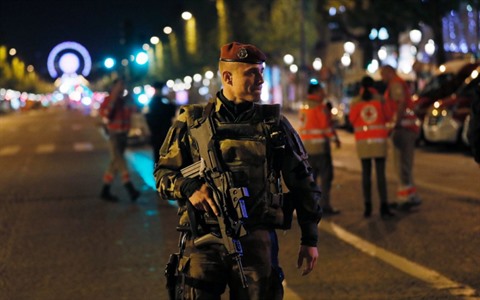 | Un militaire patrouille sur les Champs Elysées où un policier vient d'être tué, une attaque revendiquée par le groupe État islamique le 20 avril 2017 |