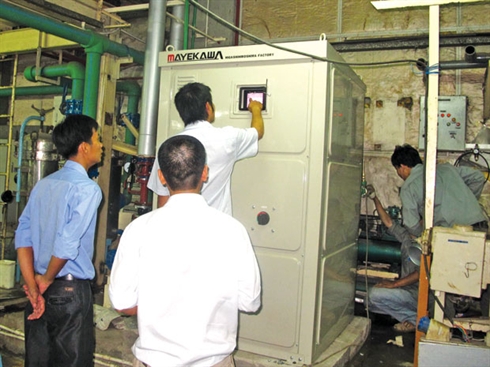 | Des ingénieurs de la compagnie Viet ESCO installent un système de contrôle de l'énergie à l’hôtel Legend (Hô Chi Minh-Ville). |