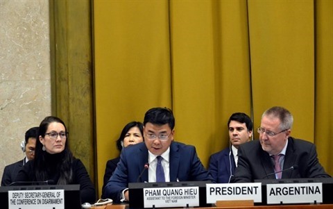 | L’assistant du ministre vietnamien des Affaires étrangères Pham Quang Hiêu (centre) lors d’une récente session plénière de la Conférence du désarmement à Genève. |