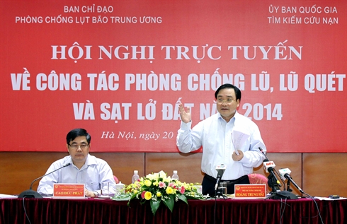 | Le vice-Premier ministre Hoàng Trung (droite) lors de la conférence sur la prévention et lutte contre les crues et glissements de terrain de 2014, le 20 août à Hanoi. |