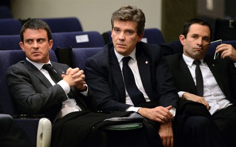 | De gauche à droite : Manuel Valls, Arnaud Montebourg et Benoît Hamon, lors d'une conférence de presse le 27 novembre 2013 à Madrid, lors d'un sommet franco-espagnol. |