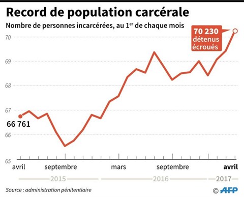 La prison de Fleury-Mérogis en région parisienne, plus grand établissement d'Europe, sort ainsi tout juste d'un mouvement de protestation des surveillants, tandis que la directrice de la maison d'arrêt de Villepinte avait annoncé fin mars que l'établissement ne pouvait plus accueillir de nouveaux détenus. Par ailleurs, l'État a été attaqué devant la justice administrative pour les conditions de détention de la prison surpeuplée de Fresnes (Val-de-Marne), où plus de 2.500 détenus cohabitent avec rats et punaises de lits.