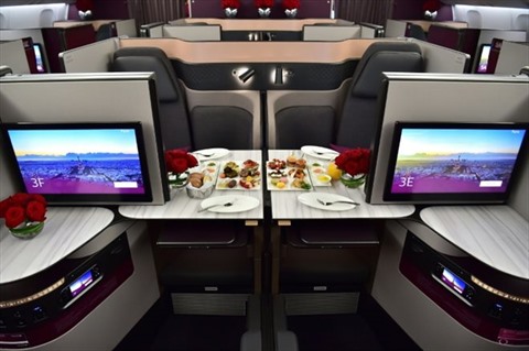| La classe affaires d'un Boeing 777 de Qatar Airways, au Bourget, le 22 juin. |